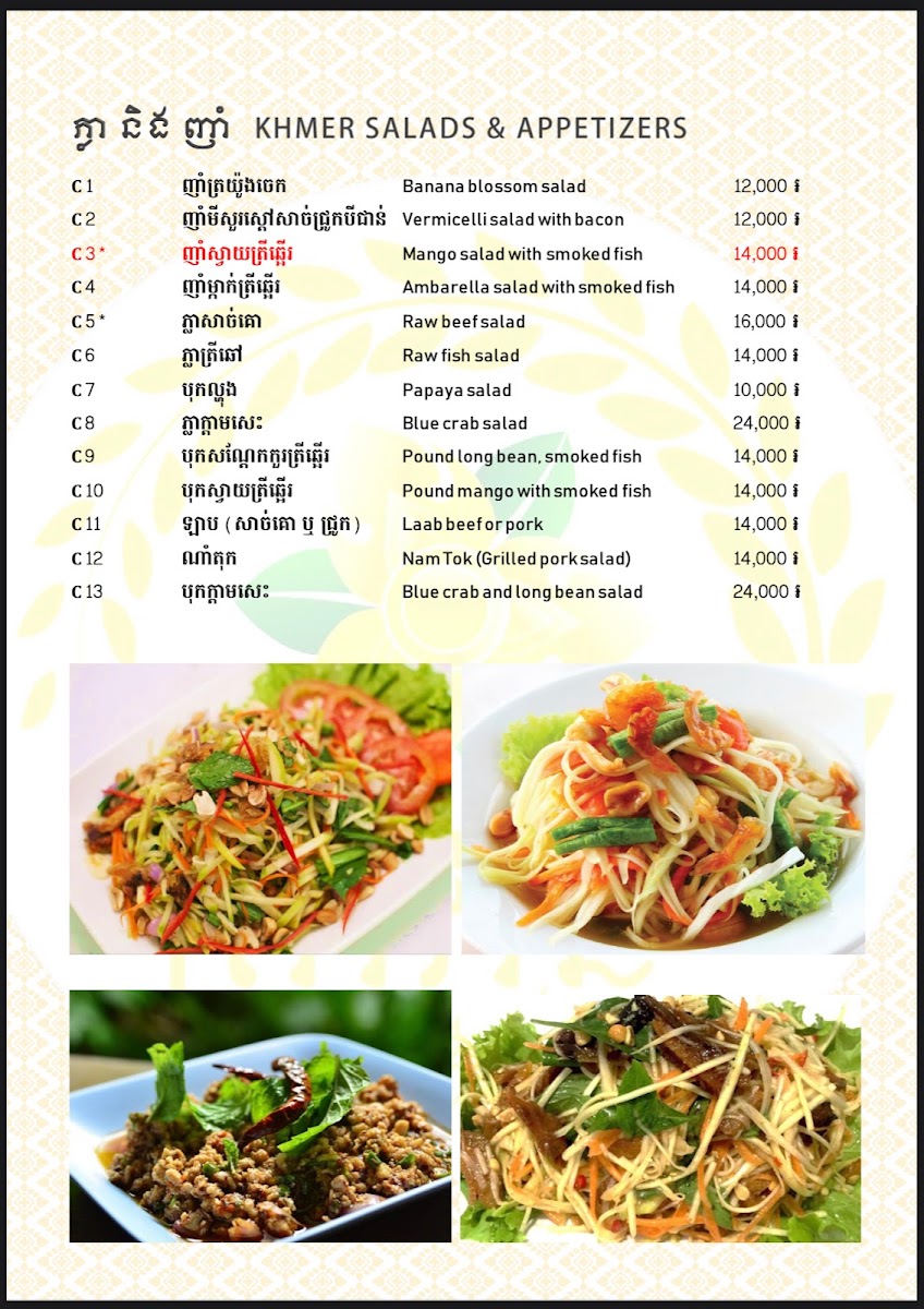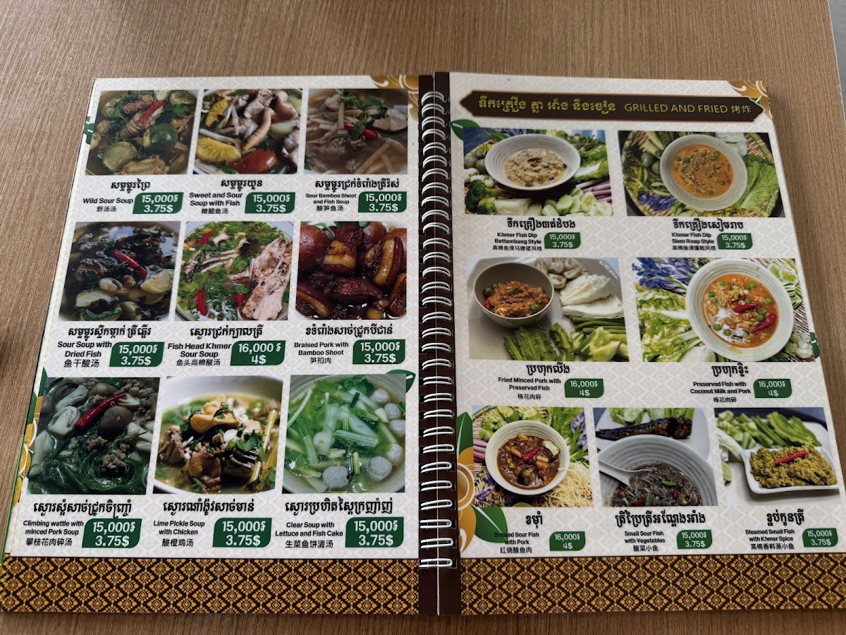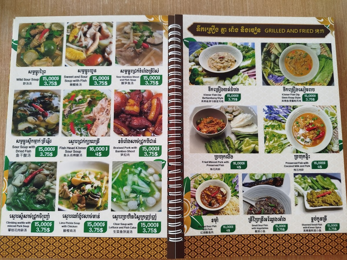 In the Soups and Stews category, the Sour soup with elephant ear plant and Sour soup with morning glory provide a tangy, refreshing flavor profile that pairs perfectly with the heat of Cambodia's tropical climate. The Dried seaweed soup with minced Pork Chops is a rich and hearty option, while the Spiced sour soup with pork ribs offers a flavorful, meaty experience.