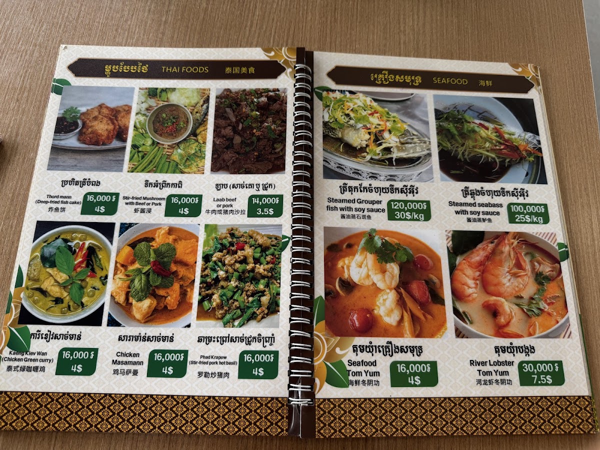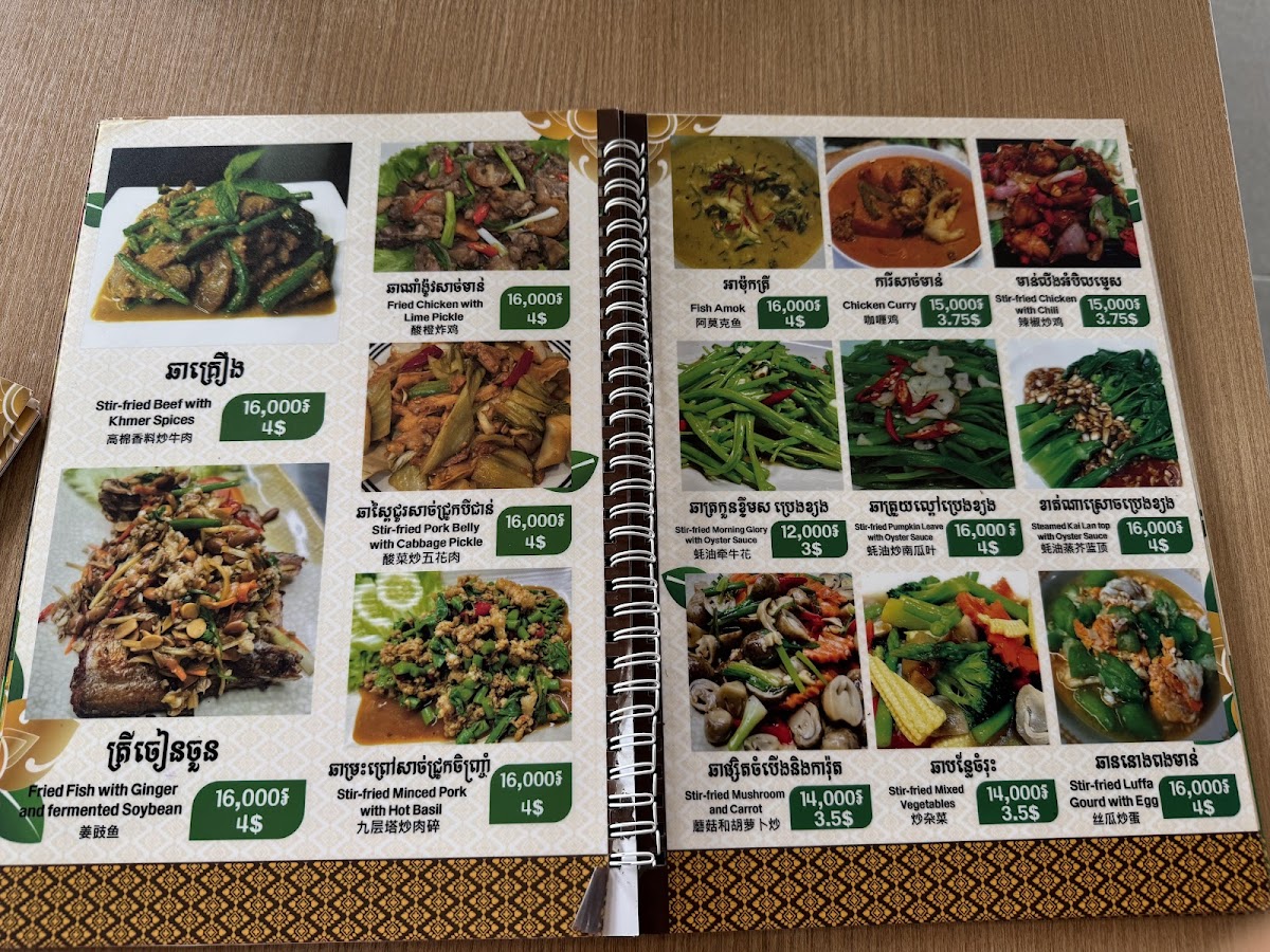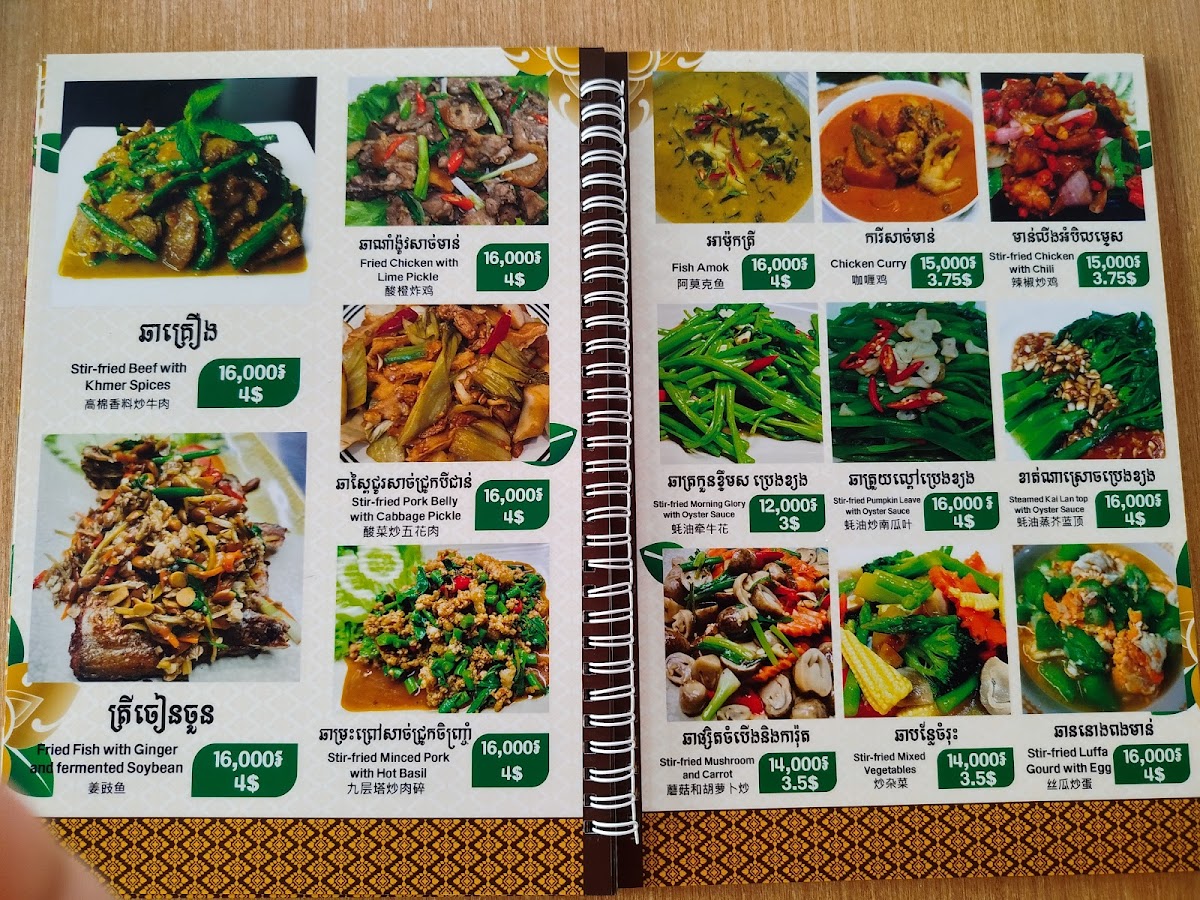 In the Soups and Stews category, the Sour soup with elephant ear plant and Sour soup with morning glory provide a tangy, refreshing flavor profile that pairs perfectly with the heat of Cambodia's tropical climate. The Dried seaweed soup with minced Pork Chops is a rich and hearty option, while the Spiced sour soup with pork ribs offers a flavorful, meaty experience.
