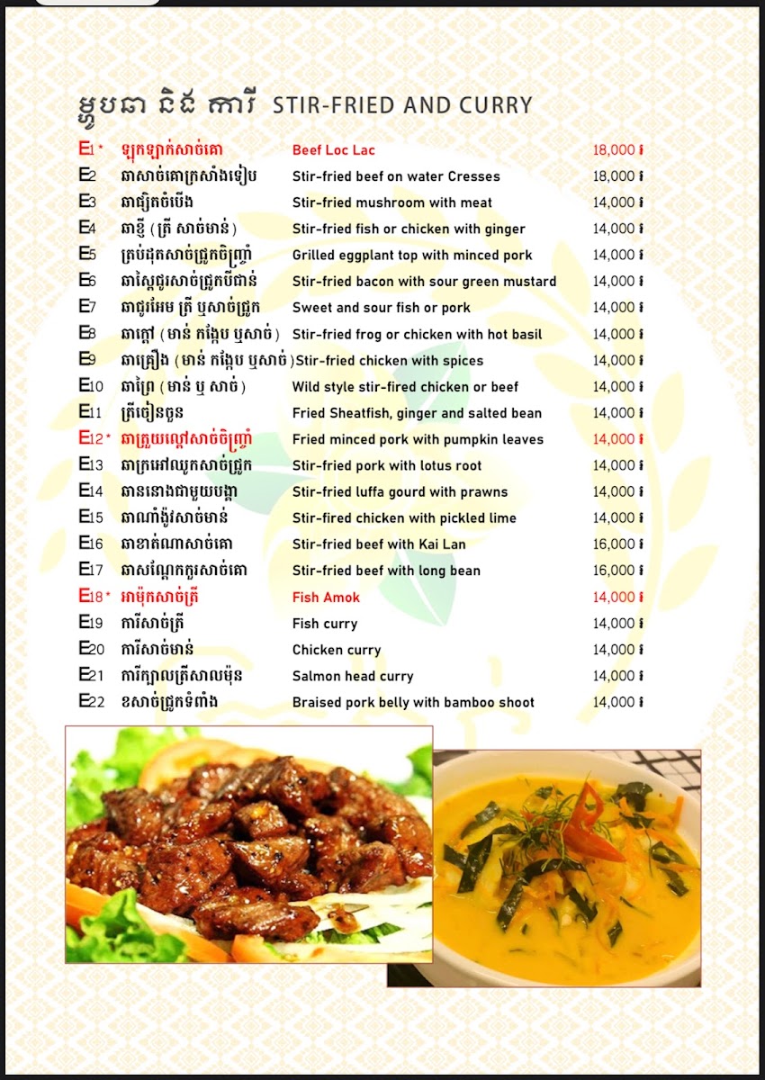 For a truly satisfying meal, the Stir-fried section has offerings such as Beef Loc Lac, a savory and tender dish, and Fish Amok, a traditional Cambodian curry with fish. The Fried minced pork with pumpkin leaves is another flavorful dish, while the Stir-fried beef on water cresses provides a unique, light option with fresh vegetables.